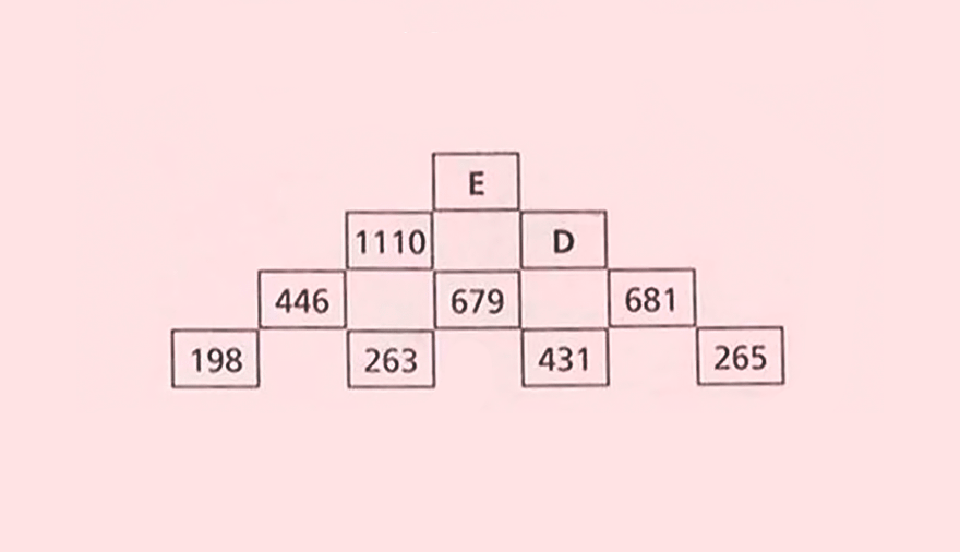 Для начала тебе нужно сложить два числа в нижнем ряду пирамиды: 198+263=461. Это число больше того, что стоит в пирамиде нам ним. Теперь из большего, то есть из 461 нужно вычесть меньшее, то есть 446. Этот же результат, то есть число 15, получишь, если проделаешь такую же работу с правой нижней частью пирамиды. Это и есть ключ к решению задачи. Несколько подобных манипуляций приведут тебя к правильному ответу, где D = 1345, а E = 2440.