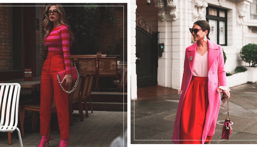 Несмотря на то, что этого цветового сочетания многие опасаются, оно выглядит дорого и эффектно. Розовый и красный цвета считаются самостоятельными и не поглощают друг друга. Особенно эффектно они выглядят в холодное время года, когда нам так не хватает ярких красок. Если не боишься модных экспериментов, смело сочетай их в одном образе и готовься ловить на себе восторженные взгляды.