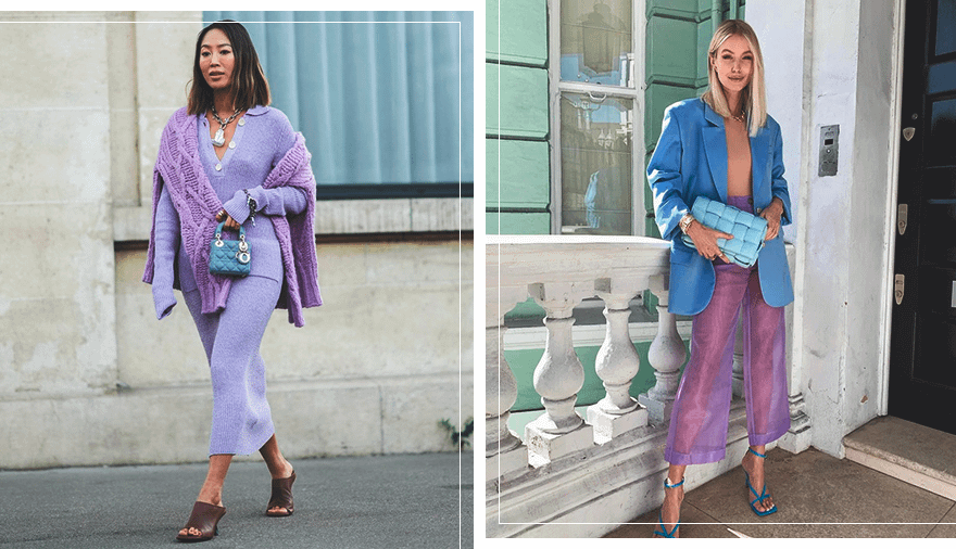 Один из этих цветов считается сложным, а другой — простым и природным. Вместе они образуют нежную и женственную пару. Образ, составленный с использованием фиолетового и голубого цветов, выглядит не только свежо, но и дорого. Интересно смотрятся не только летние шелковые и полупрозрачные вещи в этих оттенках, но и более теплая вязаная одежда. Например, трикотажное голубое платье и фиолетовая накидка крупной вязки.
