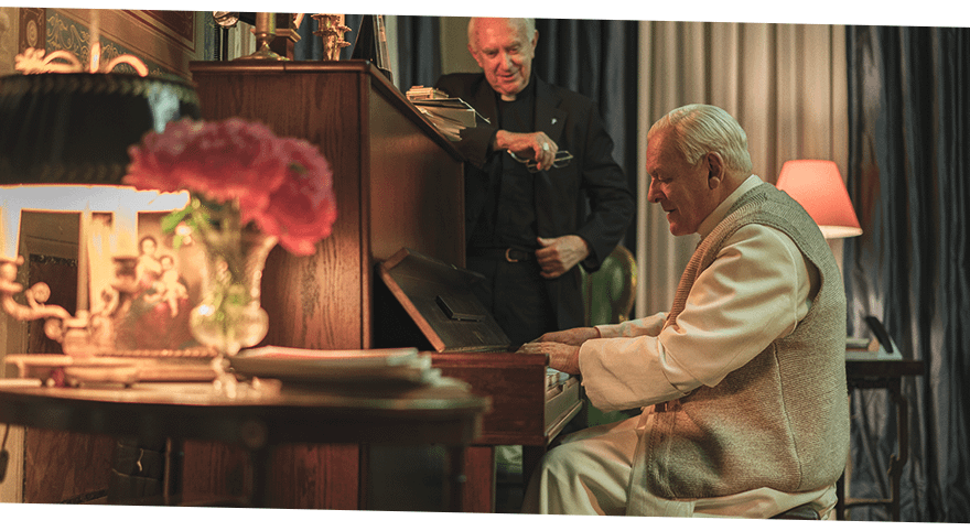 Еще один шикарный актерский дуэт можно найти в биографической драме «Два папы». Энтони Хопкинс и Джонатан Прайс играют Папу Бенедикта XVI и кардинала Хорхе Марио Бергольо.
