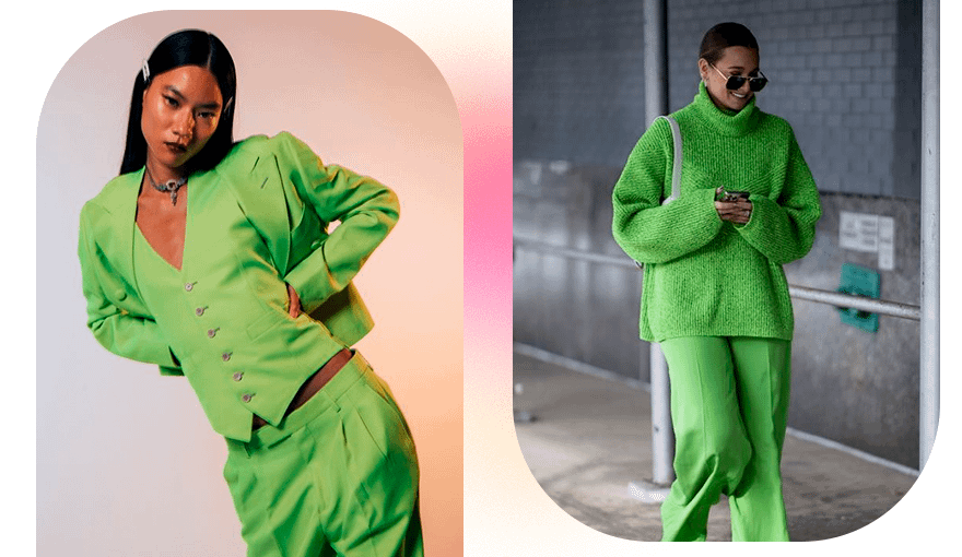 В этом сезоне в тренде брючные костюмы-тройки. Купи яркий вариант, чтобы выделиться в толпе. Если не готова к акцентным монохромным образам, используй аксессуары в природном зеленом оттенке. Например, это может быть вместительная сумка, яркие колготки или вязаный длинный шарф.