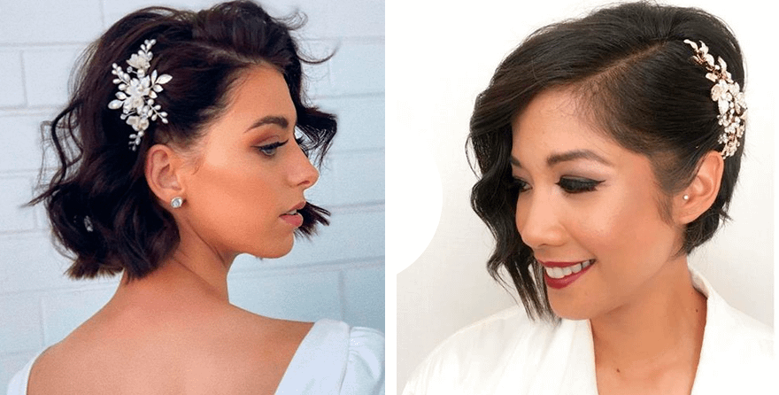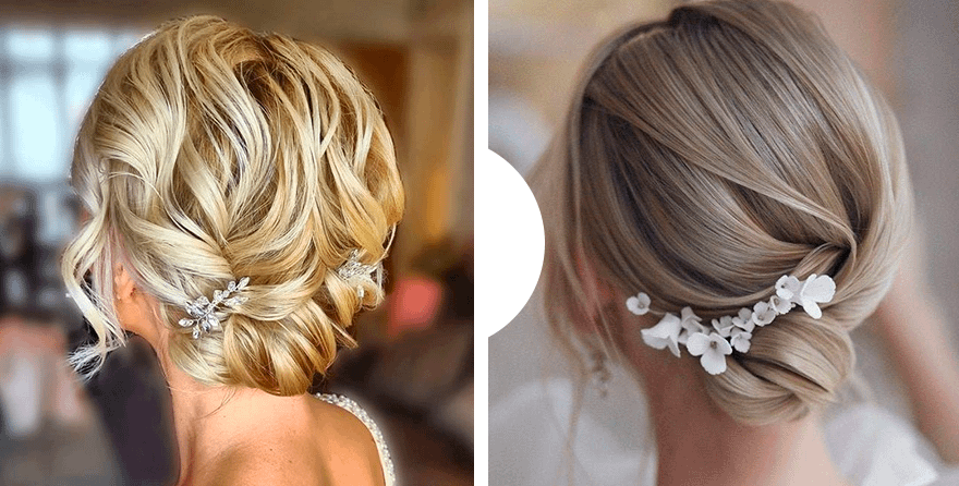 Эффектно смотрится прическа с боковым пробором, дополненная массивными или тонкими металлическими заколками с цветочным декором. Подойдут также невидимки с небольшими камнями или жемчугом.