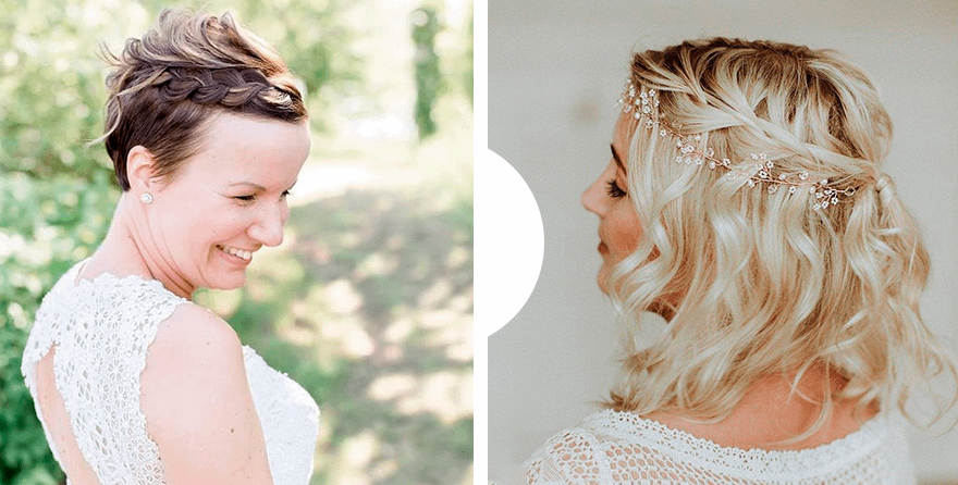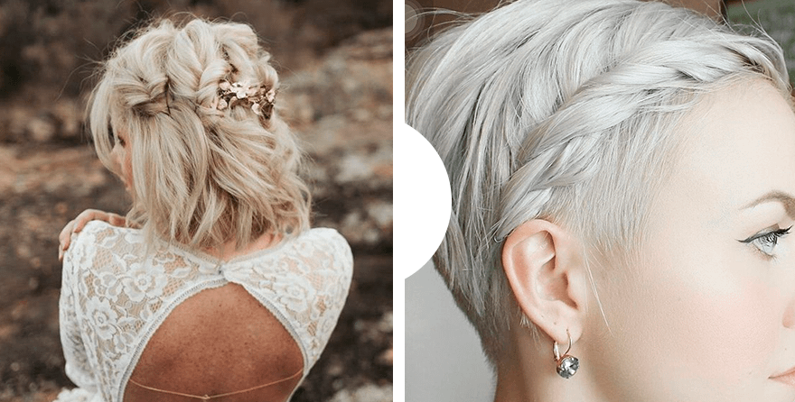 Эффектно выглядят короткие прически с косой, заплетенной у линии лба, а также вдоль виска. Если позволяет длина локонов, присмотрись к более сложным вариантам укладки, например, из нескольких кос на волосах, зачесанных назад.