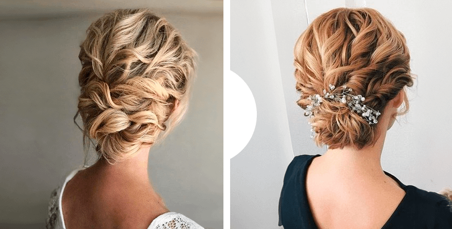 Волосы длиной до плеч или чуть короче можно уложить в низкий пучок, который смотрится элегантно. Такой вариант укладки подойдет для тех, кто хочет создать свадебный образ с фатой или сделать акцент на крое платья, например, открытых плечах или спине.