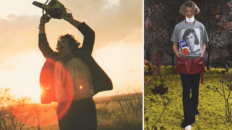 Маньяк Кожаное лицо из «Техасской резни бензопилой» стал источником вдохновения для той же коллекции. Красные и коричневые кожаные вещи напоминали кровавый фартук психопата.
