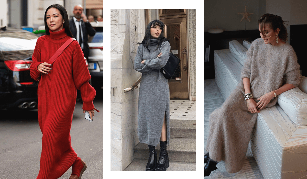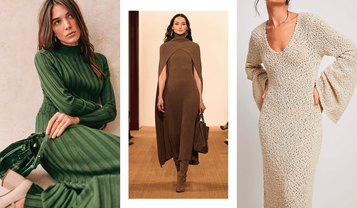 В отличие от базового трикотажного, платье-свитер, как правило, имеет свободный крой и создано из плотной пряжи. Осенью 2024-го на пике популярности удлиненные модели свободного кроя в сером, приглушенно-оранжевом, бежевом цветах. Горло может быть высоким или круглым.