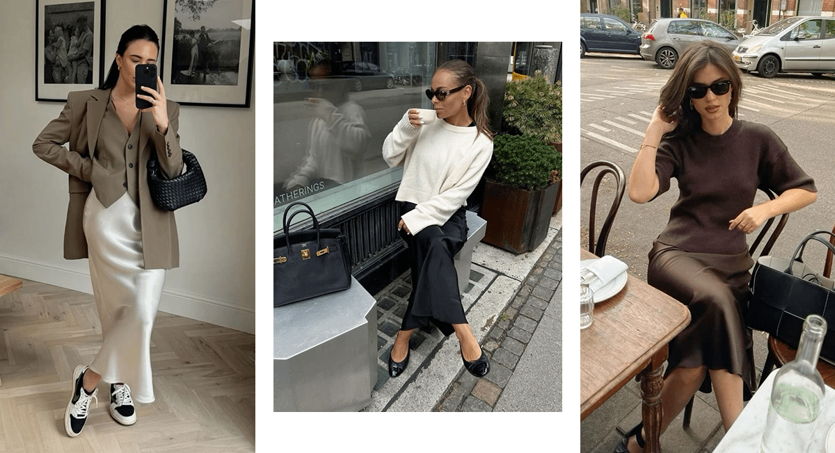 Эта вещь тоже не выйдет из моды в ближайшие годы, поскольку стала базовой в женском гардеробе. Преимущество атласных юбок в том, что их можно носить и летом — с топом или футболкой, и зимой — с объемным свитером или водолазкой. Длина миди универсальна и подходит девушкам с любым типом фигуры и весом. Она также помогает подчеркнуть женственность.