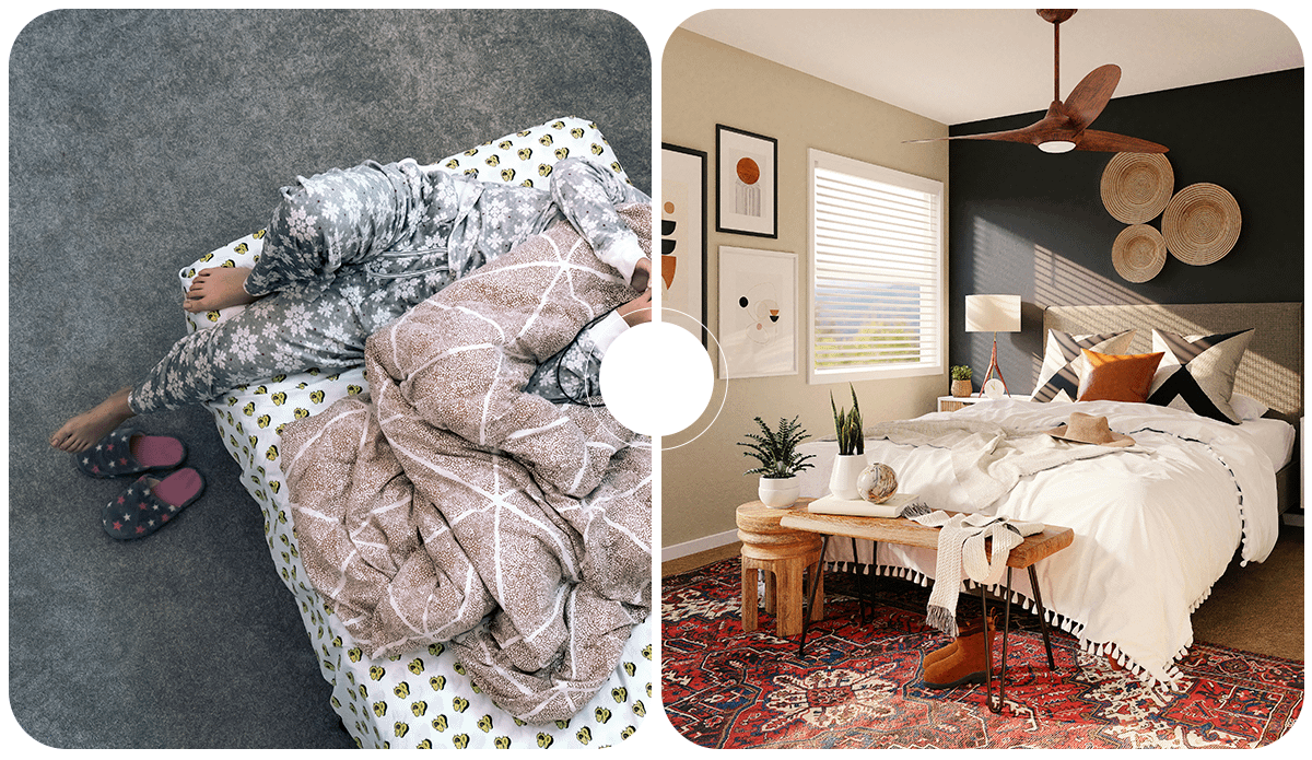 Обрати внимание, какую функцию выполняет ковер в спальне. Если ты не можешь поместить его у кровати, чтобы подъем с нее был более приятным, значит, что-то не так. Выбери модель меньшего размера или подумай о ковролине, застилающем всю комнату целиком.