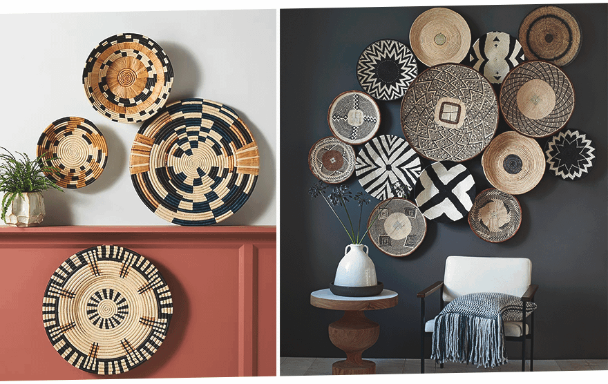 Подвесные корзины – популярный способ хранения вещей. В них можно держать кухонные принадлежности, книги, полотенца, посадить цветы. Менее функциональный, но красивый вариант – использовать нераскрытые сплющенные корзины как настенный декор. Из них можно создавать композиции или вешать поодиночке. Плетеные корзины добавят интерьеру уютной и яркой атмосферы стиля бохо.