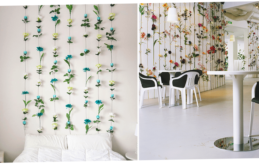 Из цветов можно делать не только букеты и композиции, но и развешивать их на стену просто так. Лучше всего для этого подойдут искусственные цветки или сухоцветы, хотя последние могут быть слишком хрупкими и с них сложнее удалять пыль.