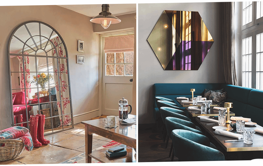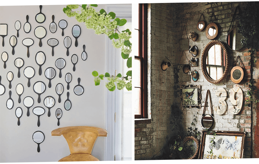 Вместо одного зеркала стену можно украсить целой галереей из небольших зеркал. Они могут быть выполнены в едином стиле или отличаться формой, размером и рамой – оба варианта притягивают взгляд. Как и большое зеркало, галерея из маленьких добавит помещению воздуха и пространства, а выглядеть будет гораздо оригинальнее.
