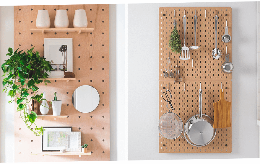 Такая доска многофункциональна: к ней можно прикрепить крючки, колышки, рейлинги или другие приспособления, установить полки, повесить корзины. Расположить их можно в любом порядке и без труда менять местами, создавая новые композиции.