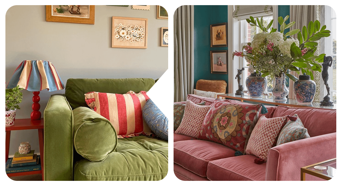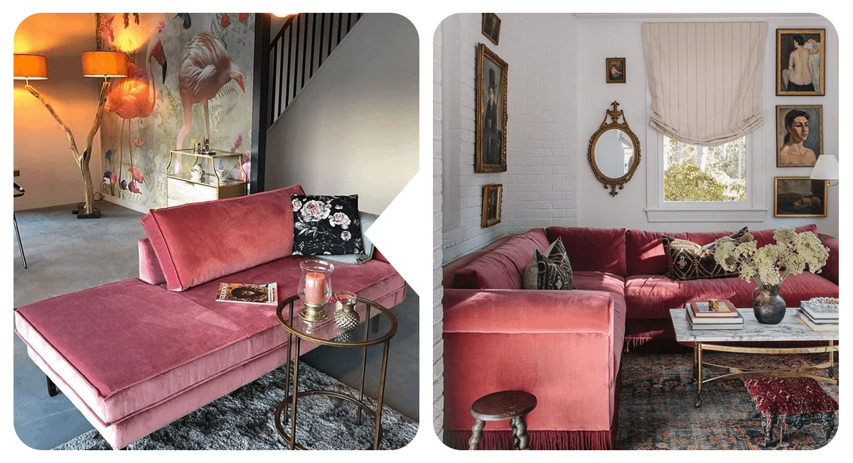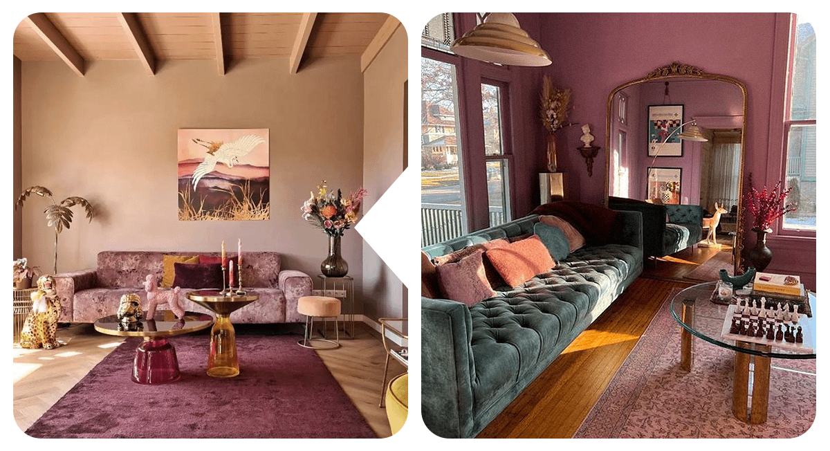 Покрась одну стену в глубокий зеленый, а остальные оставь нейтральными. Или купи бархатный диван в цвете бордо и дополни его золотыми подушками. Ты также можешь использовать бирюзовый или розовый торшер в духе 50-х.