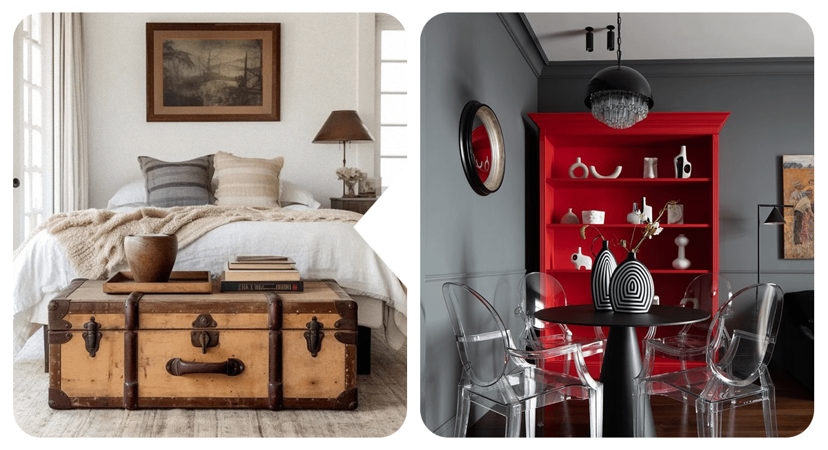 Чтобы добиться нужного эффекта, можешь поставить винтажный буфет в стиле 50-х рядом с современным стеклянным столом. Или добавить бра в духе ар-деко к стене, оклеенной обоями с психоделическим принтом 60-х. Пусть объединяющим элементом станет цвет или материал, например бархат.