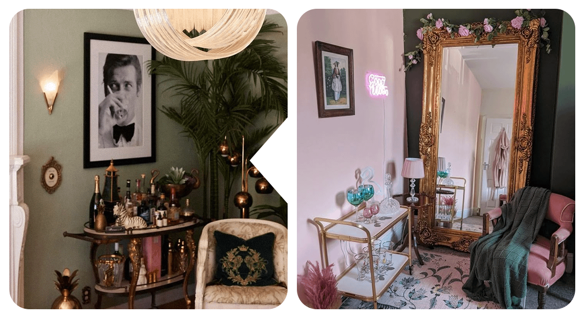 Создай уголок для аперитива в духе 1960-х. Для этого используй барную тележку на золотых колесиках, хрустальные рюмки и коктейльные бокалы, металлический поднос для напитков, винтажные штопоры и мерный стаканчик.