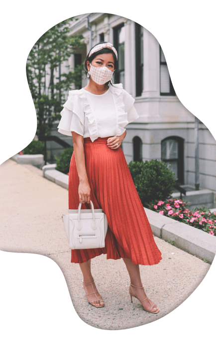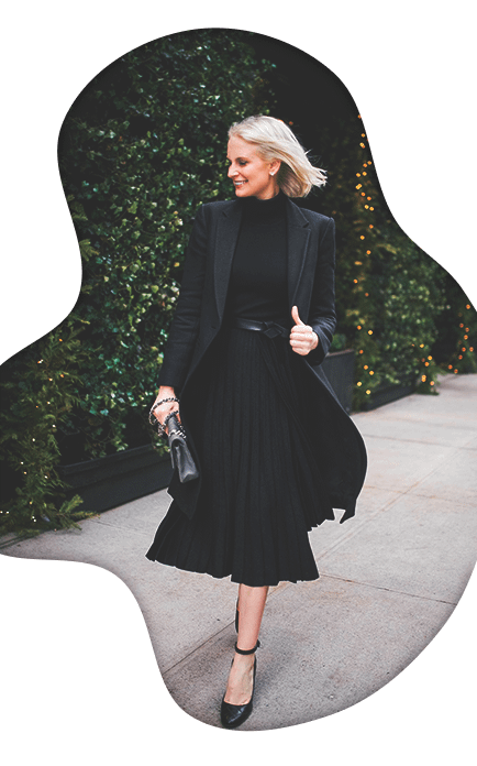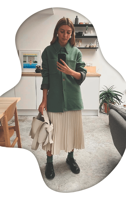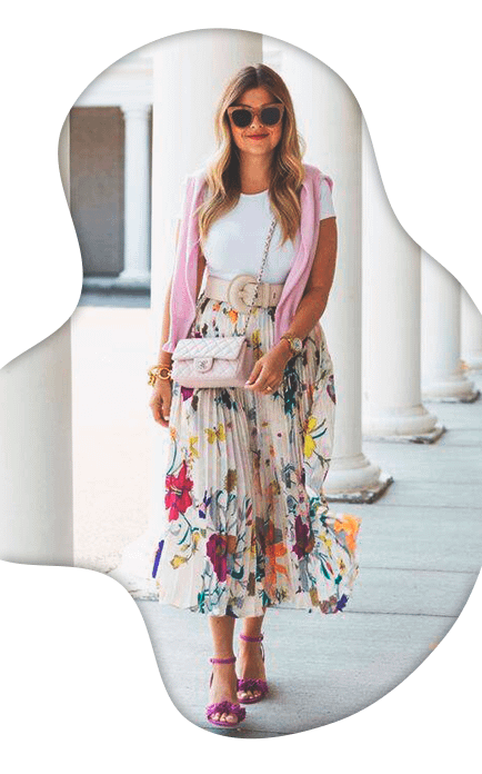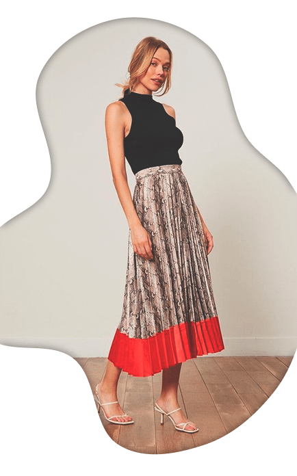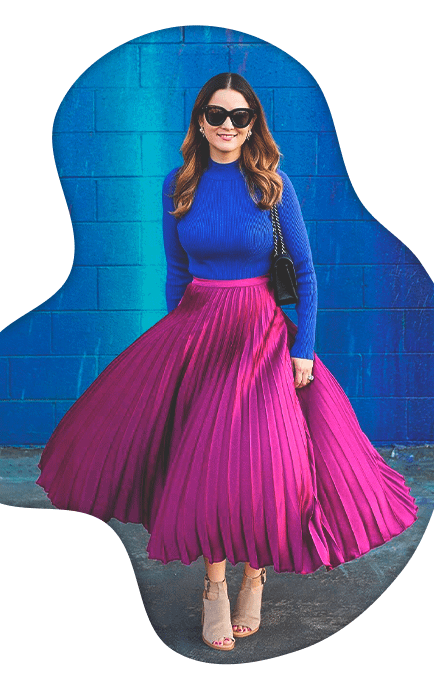 Еще один способ носить плиссированную юбку — выбрать верх и низ комплекта одного оттенка. Это поможет создать актуальный монохромный образ в классических цветах или сделать его ярким. В выборе обуви также можешь себя не ограничивать: актуально будут смотреться как туфли и ботинки на высоком каблуке, так и сандалии на плоской подошве.