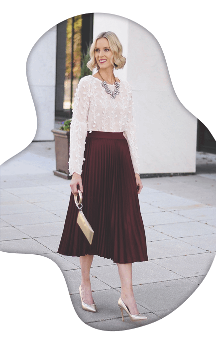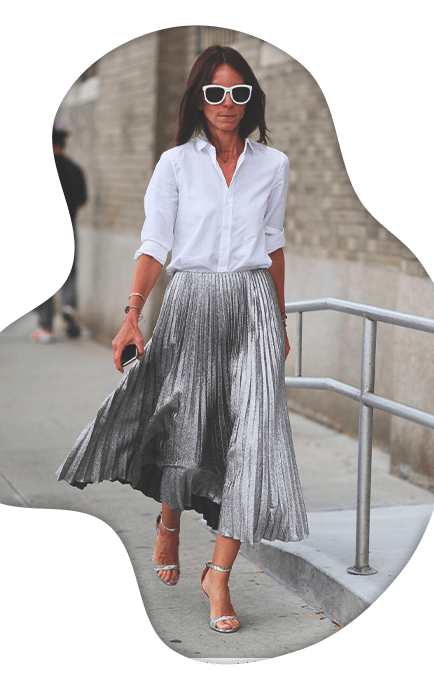 Интересно выглядят образы с плиссированной юбкой, сделанной из блестящей ткани. Это позволяет сделать стильный акцент и быстро создать праздничный наряд.