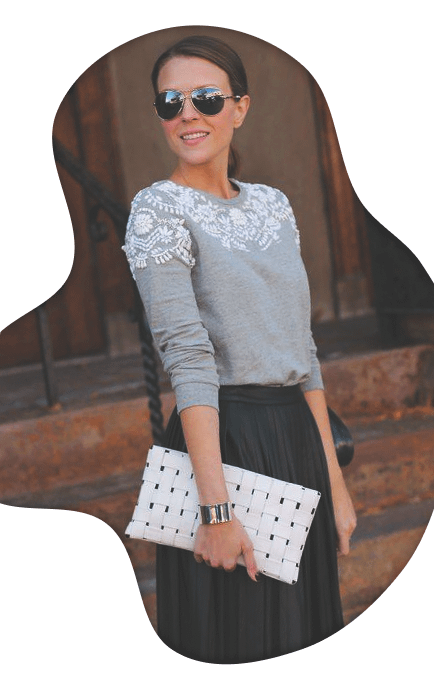 Сочетание спортивного стиля свитшотов и женственности плиссированной юбки создают эффектный контраст. Такой образ можно дополнить лоферами и кроссовками. Отлично будут смотреться и ботинки на небольшом каблуке или плоской подошве. Можешь надеть свитшот поверх юбки или заправить его внутрь. Обрати внимание, чтобы край свитшота не просвечивал через ткань юбки, иначе образ будет смотреться неряшливо.