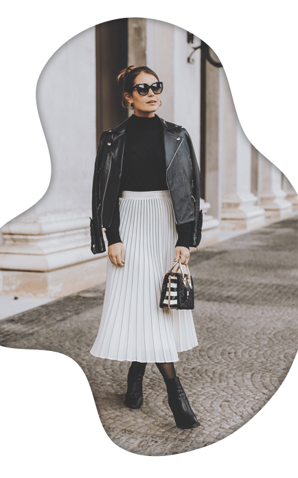 Образы с плиссированной юбкой и водолазкой выглядят женственно и отлично подойдут для прохладного дня. Можешь подбирать монохромные комплекты или делать яркий акцент на одном предмете гардероба. А также дополнить образ пальто, тренчем или кожаной курткой.