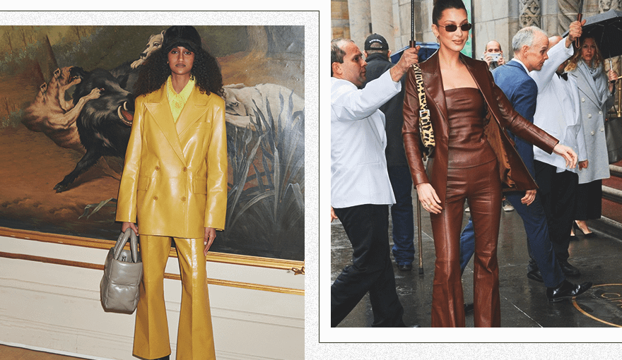 Натуральная и экокожа остаются самыми востребованными материалами уже не первый сезон. Но если раньше в одном образе носили только одну кожаную вещь, то теперь стилисты советуют присмотреться к полноценным костюмам. Идеально, если он будет выполнен в духе 80-х: с удлиненными штанами, расширяющимися к низу, и пиджаком или курткой на молнии.