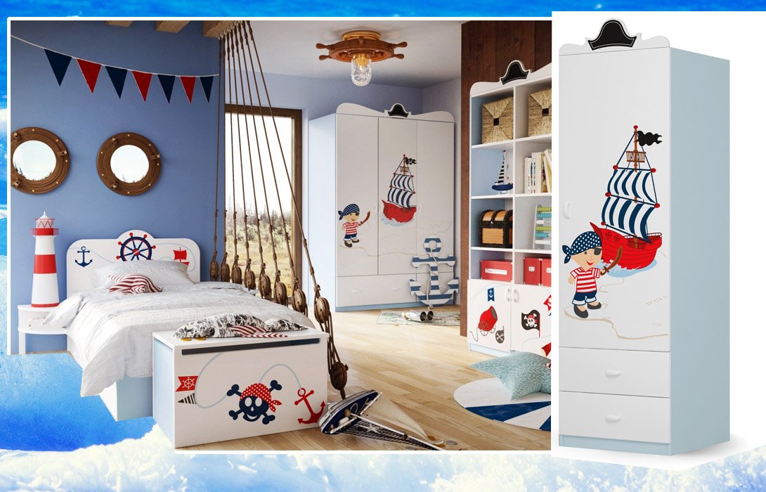 Стеллажи и шкафы с яркими рисунками вместят много пиратских сокровищ. Не забудь про антураж: обои в сине-голубой гамме, якорь, канаты, полосатое покрывало с подушками.