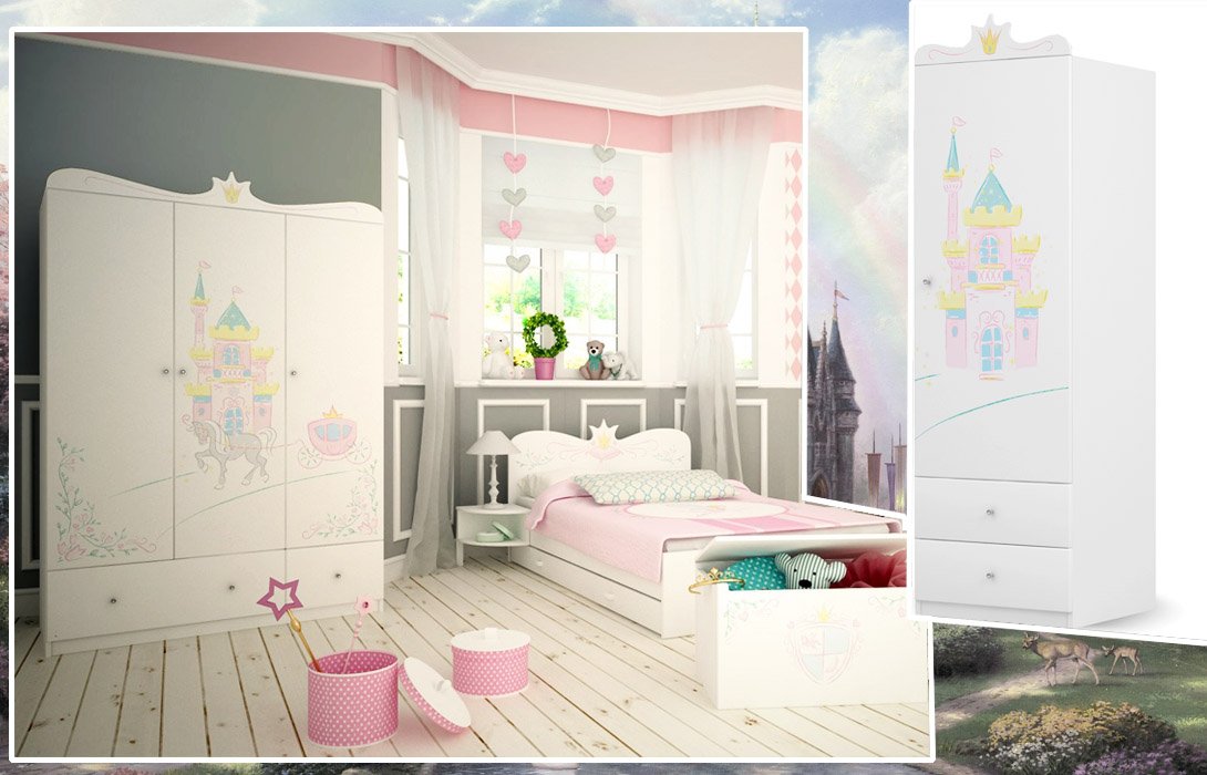 Роскошная кровать с короной у изголовья, изящный комод с зеркалом, шкаф с изображением замка и кареты с лошадью в нежных бело-розовых цветах создадут волшебную атмосферу. Выбирай обои сиреневых, пудровых и бежевых оттенков. Для завершения стиля не забудь про розовый ковер с цветочным принтом, покрывало с подушками и яркий мягкий пуф.