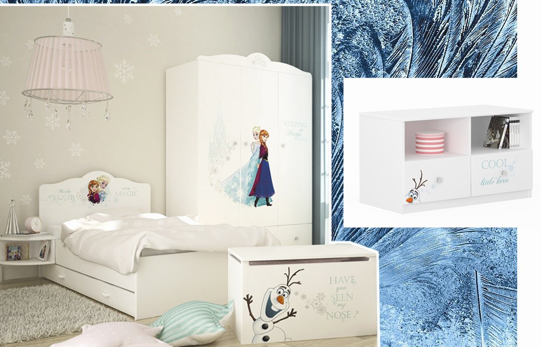 Большой трехстворчатый шкаф с закругленными углами и изображением героинь мультфильма в полный рост функциональный внутри и безопасный снаружи. Дополни интерьер ящиком для игрушек со снеговиком Олафом, столиком для творчества и стилизованным покрывалом и подушками.