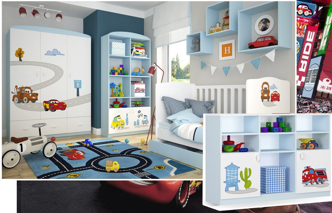 Комнату мальчика можно превратить в уголок городка Радиатор Спрингс из мультфильма «Тачки». В коллекции мебели по мотивам мультика кровать с легендарной гоночной машиной – Молнией Маккуином, бело-голубой шкаф с лучшим другом главного героя Мэтром, небольшой столик с удобным стулом.