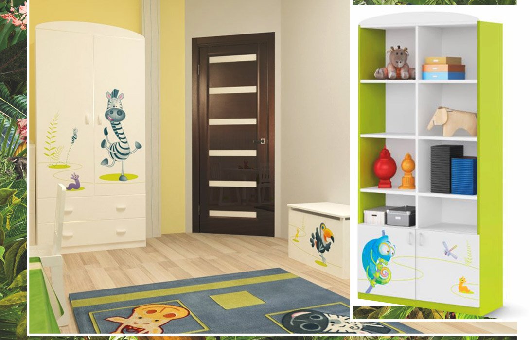 Тропическая тема универсальна, поэтому отлично подойдет для общей детской, в которой живут мальчик и девочка. Принты с изображением животных на светлом фоне понравятся малышам. Мебель в бело-салатовой гамме выглядит ярко и свежо, но не раздражает глаз.