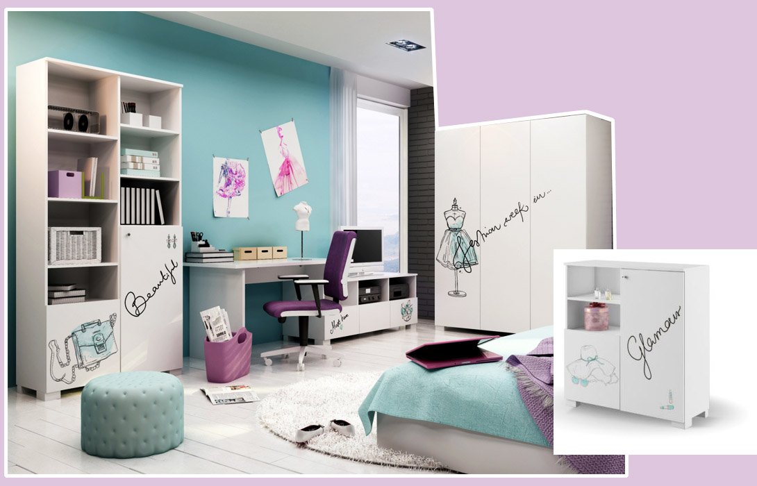 Для комнаты девочки-подростка подойдет стильный дизайн с отсылкой к парижскому шику и модным подиумам. В этой коллекции белоснежный шкаф, комод с зеркальцем, стол, украшенные нежными принтами, будто вырезанными со страниц глянца и витиеватыми надписями. Белая мебель выглядит безукоризненно и позволяет тебе самой расставлять цветовые акценты в интерьере.