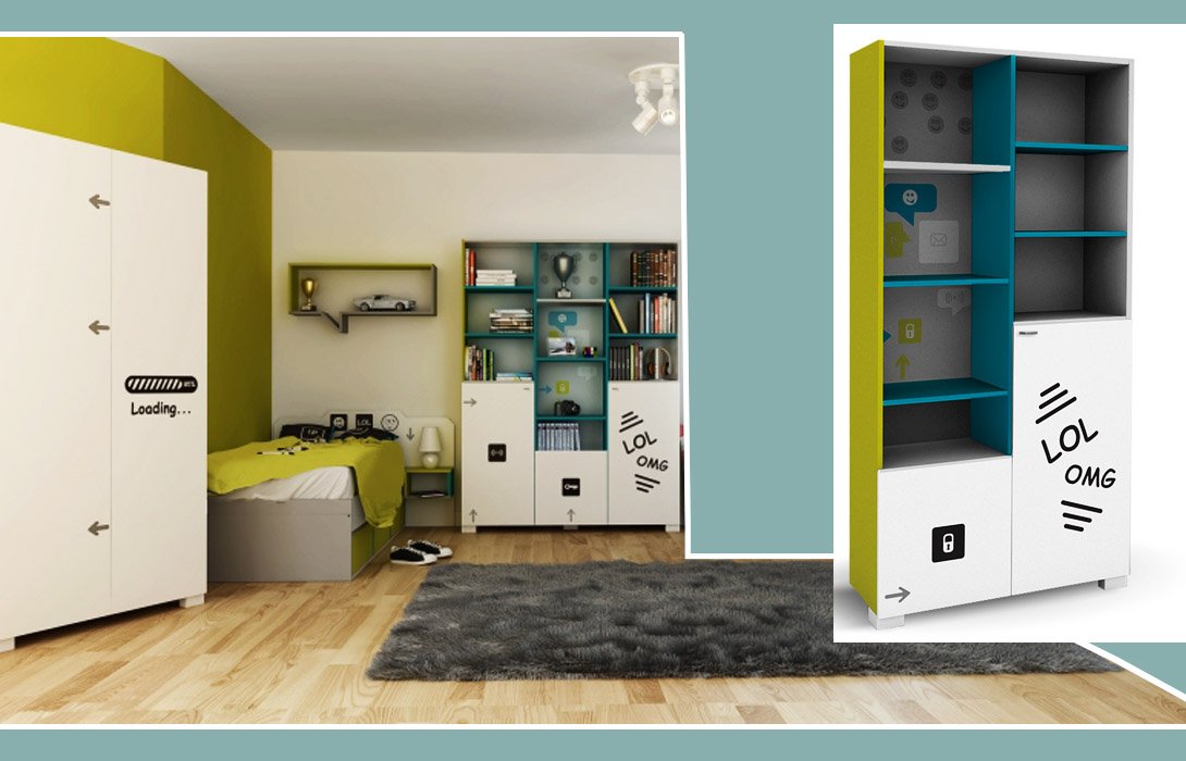 Тема интернет-культуры — абсолютный лидер современной подростковой моды – наверняка подойдет для оформления комнаты мальчика. В коллекции мебель оригинального дизайна: письменный стол на одной ноге, будто зависший в воздухе, лаконичные шкафы со значками Wi-Fi и аббревиатурами из интернет-сленга.