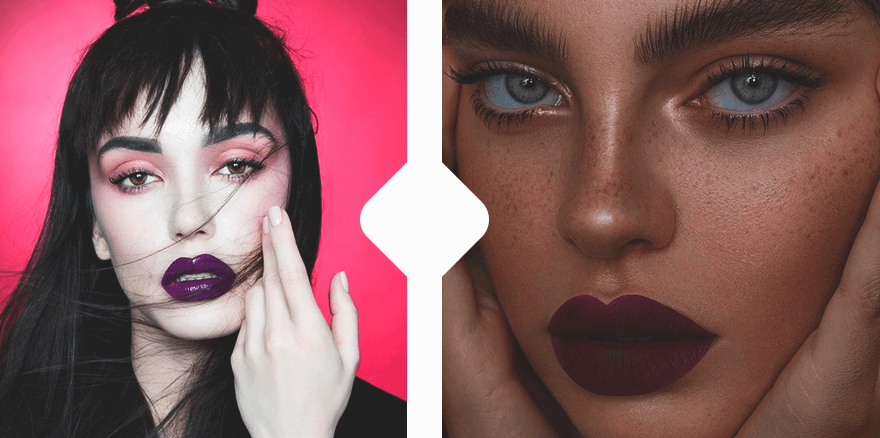 Фиолетовый и его оттенки — один из главных трендов этого года. Если твоя задача состоит в том, чтобы создать необычный и яркий образ для фотосессии или тематической вечеринки, смело выбирай помаду в темно-фиолетовом цвете. Она хорошо сочетается в макияжем в оттенках розового и гармонично выглядит как на пухлых, так и на довольно тонких губах.