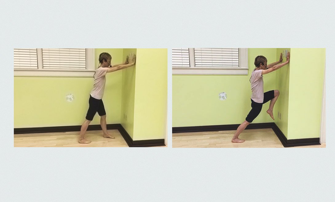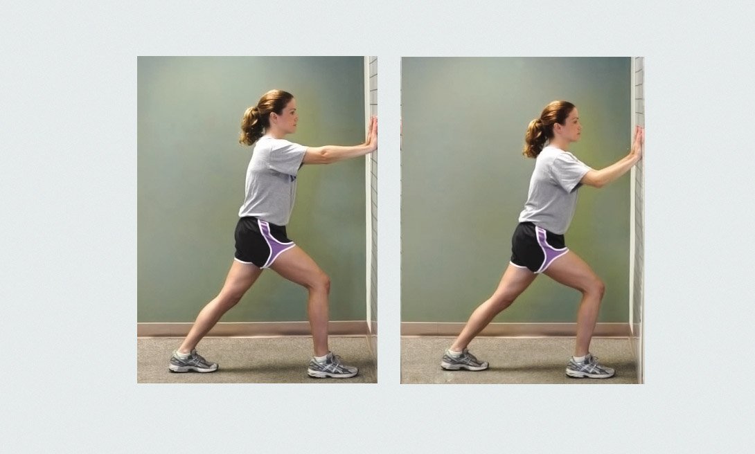 Встань лицом к стене. Отступи на один шаг назад, положи ладони на стену на уровне плеч. Пострадавшую ногу отодвинь назад, согни другое колено как можно выше и подвинь бедра к стене. Руки должны оставаться прямыми. Прочувствуй, как тянутся мышцы, и удерживай это положение в течение 3-х секунд. Медленно вернись в исходное положение, потом повтори еще три раза.