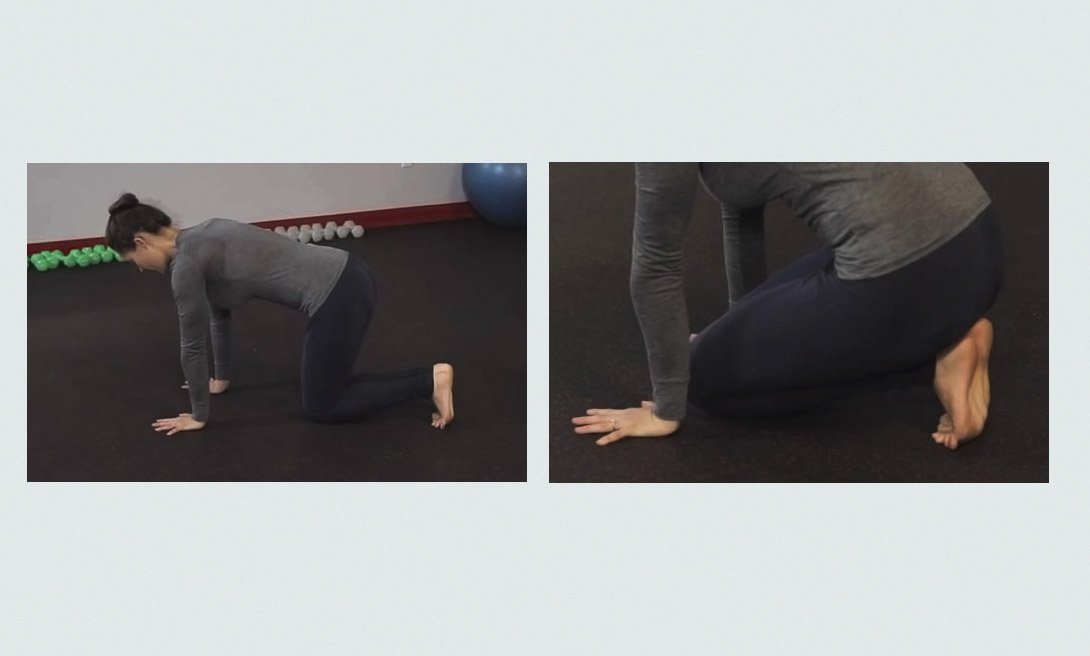 Встань на четвереньки так, чтобы пальцы твоих ног были согнуты. Отодвинь руки назад ближе к коленям и сядь на пятки. Почувствуй растяжку в стопе, и, если тебе достаточно удобно, положи руки на бедра. Удерживай это положение 10-15 секунд, затем смени положение.