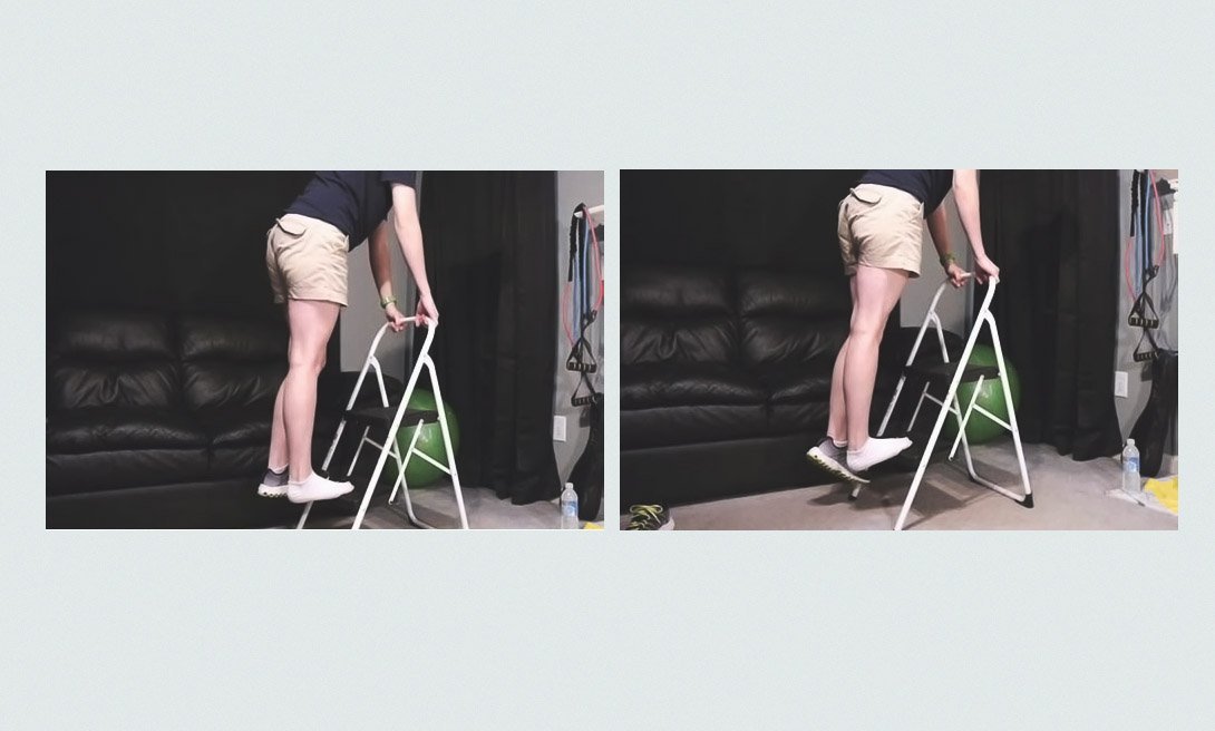 Для этого упражнения используй стремянку: поднимись на нее обеими ногами, а затем спусти одну ногу так, чтобы пятка свисала со ступеньки. Удерживай такое положение 20-30 секунд и повтори еще три подхода.