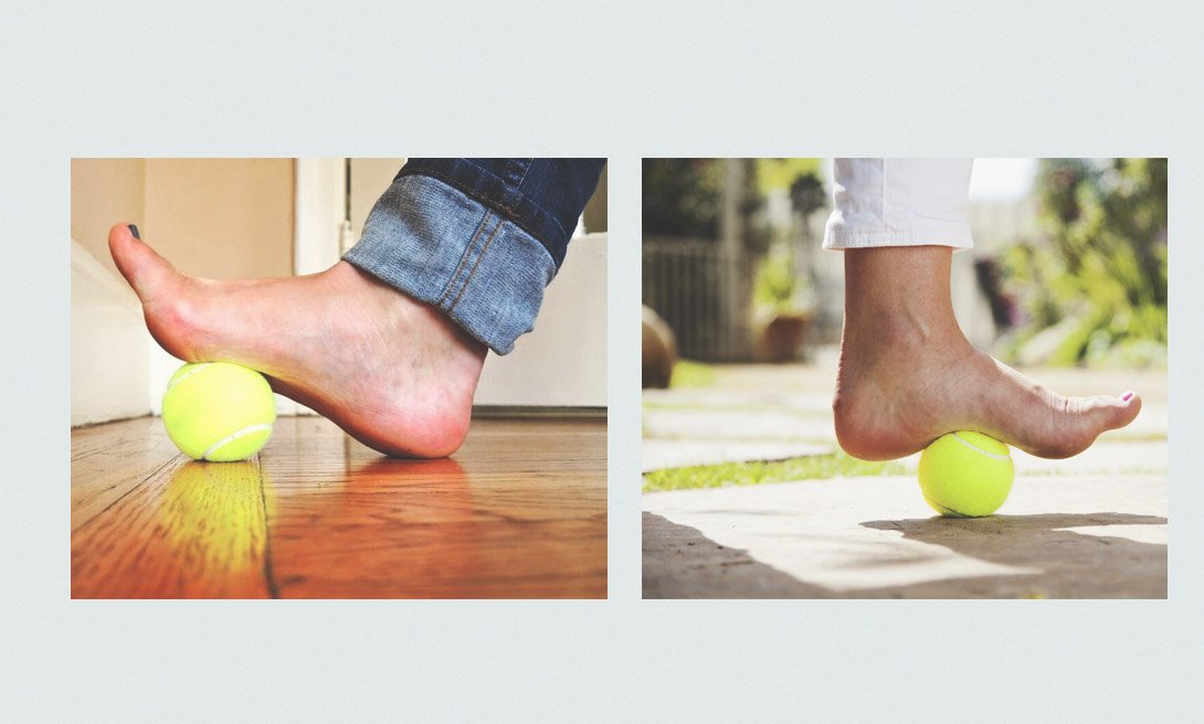 Сядь на стул или край кровати. Поставь пострадавшую ногу на теннисный мяч, затем перемещай ногу по нему, массируя подошвенную фасцию. Продолжай это упражнение до тех пор, пока не почувствуешь, что наступать на пол становится проще. Ты также можешь использовать небольшую пластиковую бутылку с водой или специальный массажный валик.