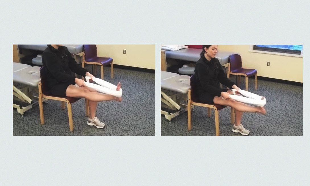 Используй свернутое полотенце — сидя на стуле, обхвати им стопу. Затем поднимай ногу от пола и удерживай перед собой, держась за оба конца полотенца. Через 10-30 секунд растяжки сдвинь положение полотенца к пятке и удерживай еще 30 секунд. Повтори еще три подхода.