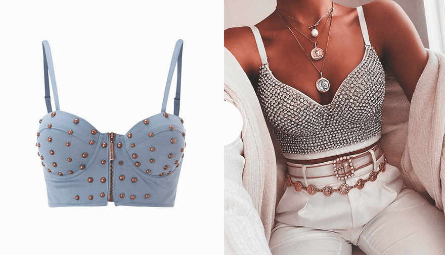 Топ с большим количеством страз — еще одна вещь, которая сделает твой образ вульгарным. Особенно если речь о модели с акцентом на декольте. Не менее вызывающе будут выглядеть кружевные топы и модели со шнуровкой на груди.