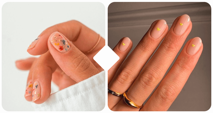 Этим летом особенно актуален прозрачный маникюр с изображением цветных сердечек, луговых растений и детских принтов. Учитывай, что лучше всего такой дизайн выглядит на коротких ногтях.