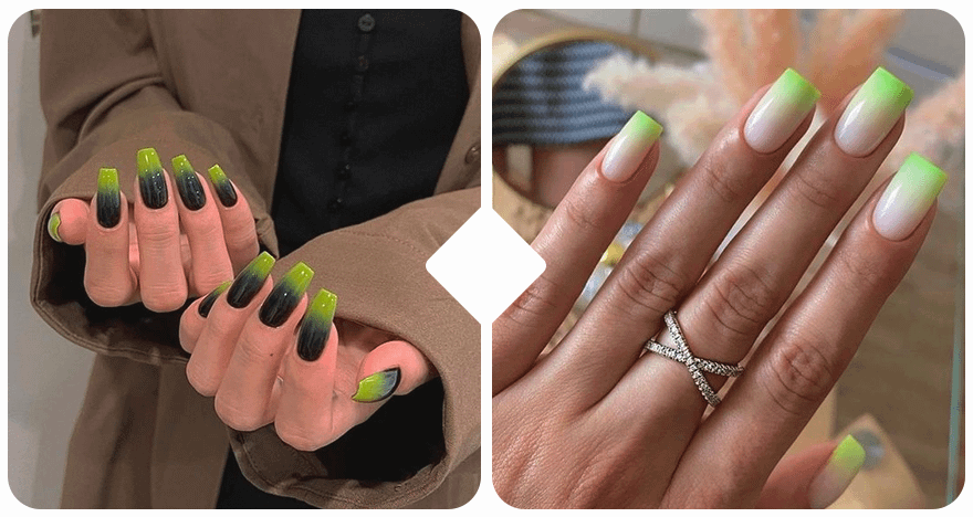 Если хочешь визуально удлинить пальцы, попроси мастера изобразить на твоих ногтях градиент. В этом сезоне особенно актуален яркий градиент, то есть с использованием двух насыщенных оттенков. Например, черного с зеленым или желтого с фиолетовым.