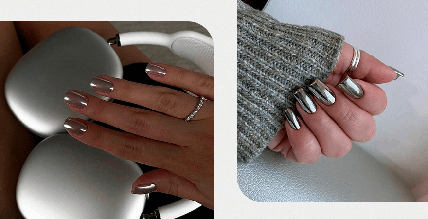 Этот вариант покрытия считается одним из самых эффектных в этом году. Во многом это связано с повальным увлечением модных инфлюенсеров эстетикой нулевых и гранжем. Металлический маникюр может стать отличным дополнением к образам в этих стилях и завершить аутфит.