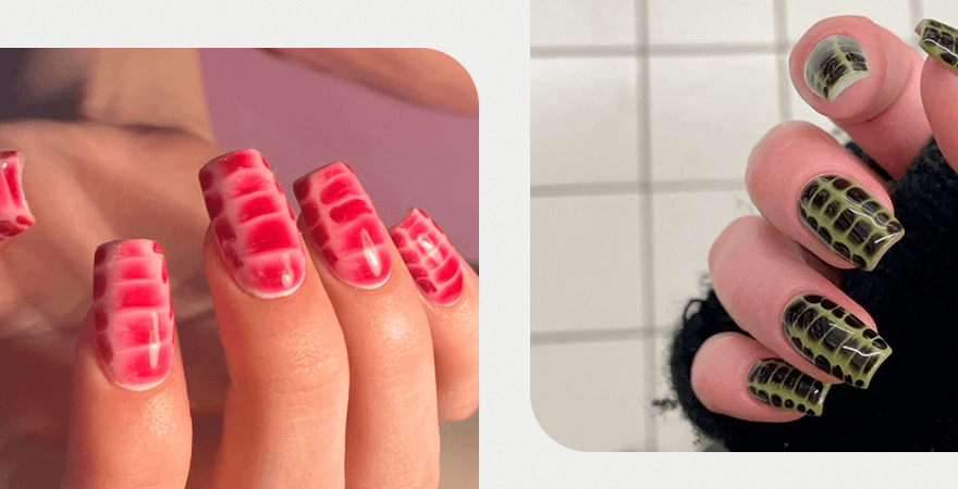 В тренде маникюр со змеиным принтом в необычных оттенках. Например, зеленом, розовом или фиолетовом. Наиболее удачно такое покрытие выглядит на длинных ногтях квадратной или миндалевидной формы.