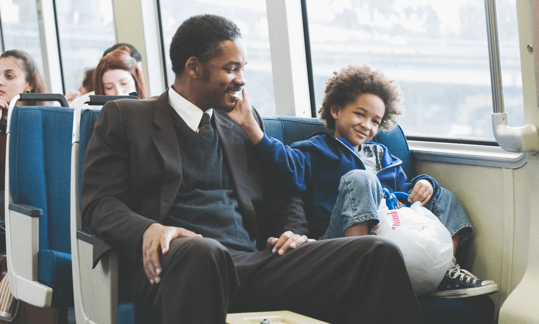 Отец и сын вынуждены спать в туалете метро и побираться в церкви. Но, несмотря на ужасные условия, главный герой завершает программу стажировки в крупной фирме и получает хорошую работу.
