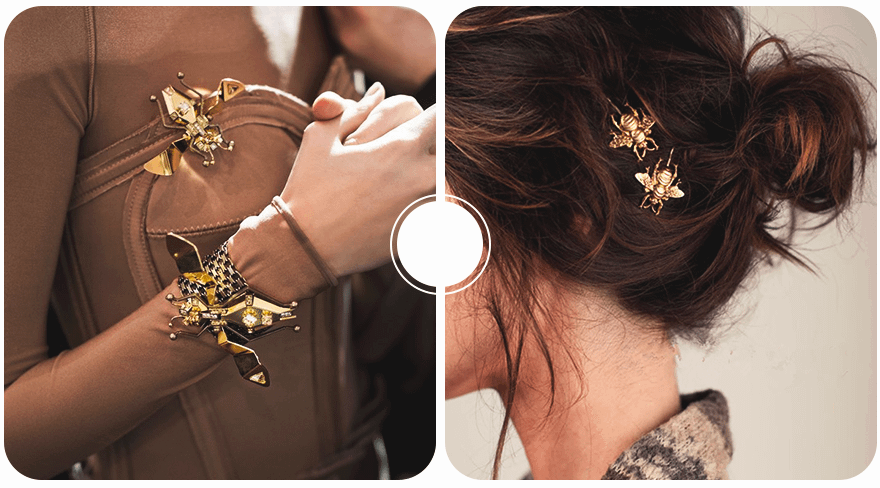 При этом речь идет не только о заколках и брошках. Не менее актуальны крупные браслеты, украшенные объемными пчелками или мухами.