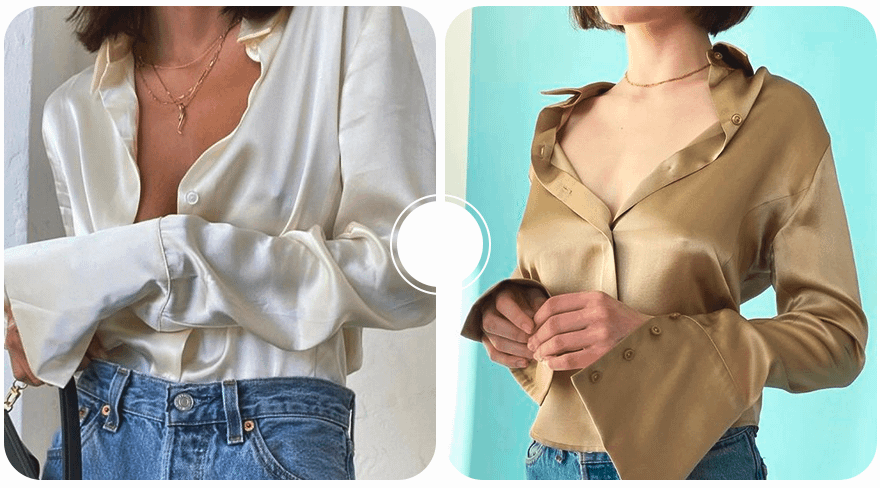 В этом сезоне предпочтение рекомендуем отдавать блузкам из шелка или другого скользящего материала. Особенно актуальны модели с удлиненными чуть широкими рукавами. Они помогают визуально вытянуть образ и делают его более хрупким и женственным.