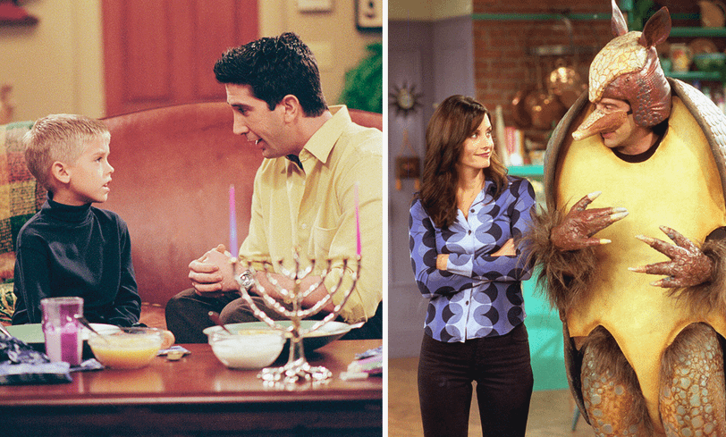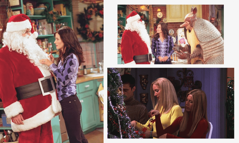 Самые яркие эпизоды «Друзей» обычно были посвящены Дню Благодарения, но на Рождество выпало несколько отличных серий. В первой события проходят в канун Рождества. Так как в магазине не находится костюмов Санты, Росс переодевается в костюм броненосца, а заодно учит своего сына — в исполнении маленького Коула Спроуса — значению настоящей Хануки. Другая серия посвящена празднованию Нового года, и в ней Росс и Моника вспоминают свой знаменитый танец брата и сестры.