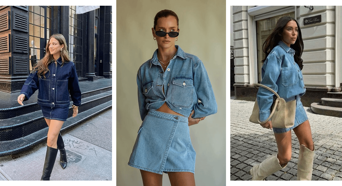 Одежда из плотного денима — мастхэв этого сезона. Не отказывай себе в возможности носить несколько джинсовых вещей в одном образе. Например, можешь примерить юбку из денима и рубашку из того же материала. Подбери вещи так, чтобы они были примерно одной цветовой температуры. При желании можешь заменить рубашку джинсовой курткой. Ее надевай на голое тело или поверх однотонной футболки или бадлона.