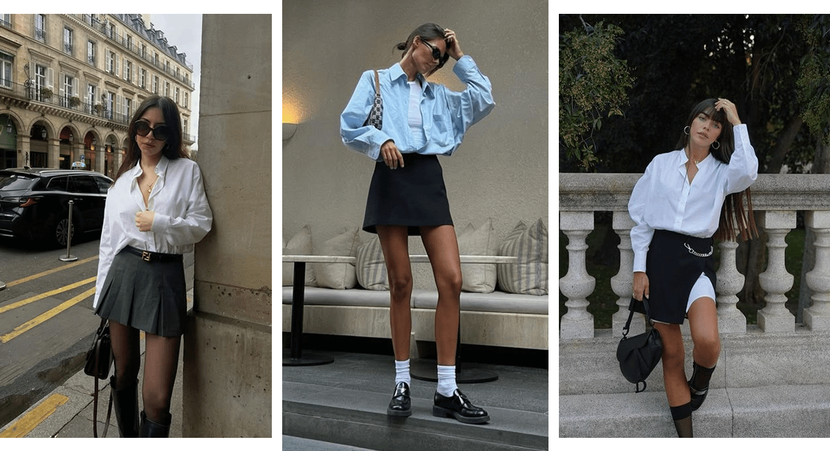 Белые и голубые классические рубашки актуальны в любое время года. Они хорошо сочетаются не только с брюками, но и с мини-юбками прямого кроя. Надень под рубашку майку-алкоголичку или базовую футболку, чтобы дополнительно утеплиться и усложнить аутфит. Не забудь об аксессуарах: крупных сережках, солнцезащитных очках, часах с красивым ремешком. Кстати, если рубашка очень длинная, можешь заправить ее так, чтобы она выглядывала из-под подола мини-юбки. Образ получится женственным и эффектным.