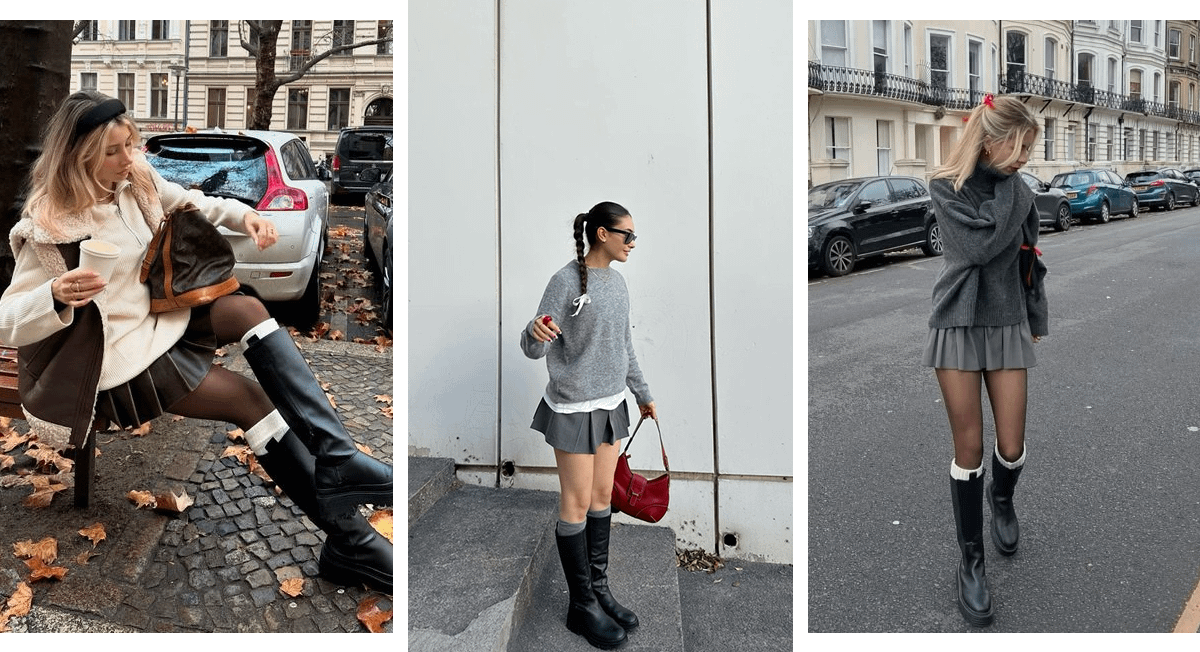 Если не готова отказываться от возможности носить мини-юбку даже в конце осени, сочетай ее с высокими сапогами. Желательно, чтобы они были на плоской подошве — это хороший способ сделать образ женственным и не выглядеть вызывающе. Чтобы усложнить аутфит, также надень черные колготки и светлые гетры. Подбери подходящий по оттенку к юбке свитер или лонгслив и не забудь аккуратно уложить волосы.