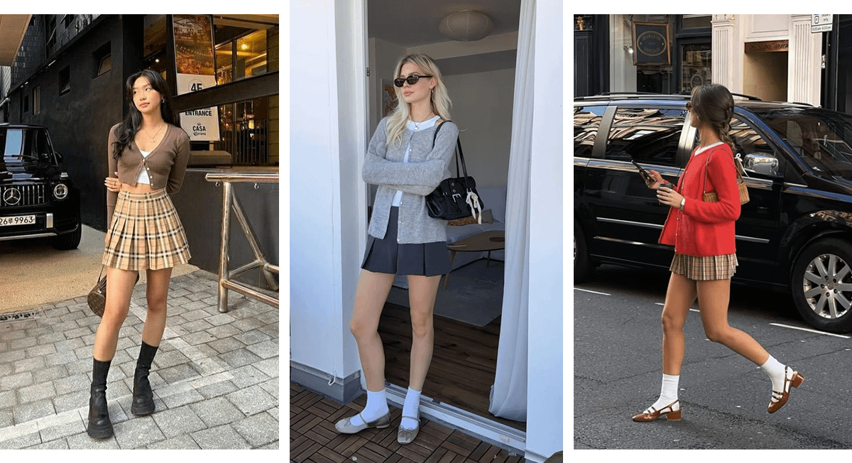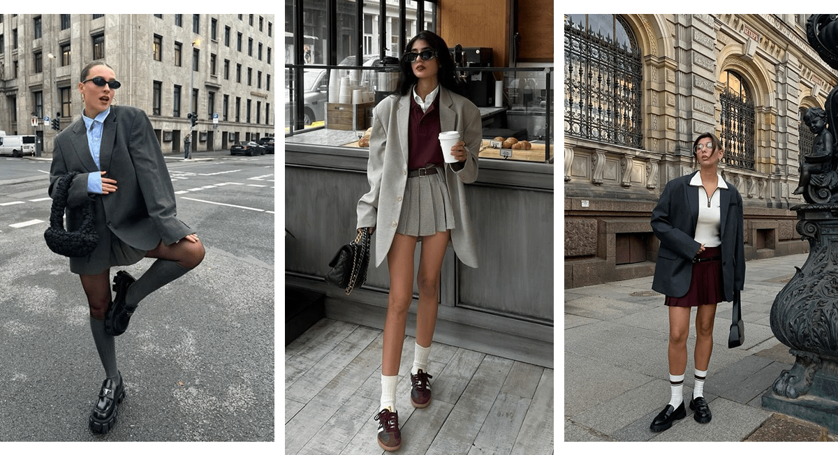 Возможно, в твоем гардеробе уже есть оверсайз-жакет или пиджак, который ты давно одолжила у парня. Используй эту вещь, чтобы сделать образ с мини-юбкой более интересным и женственным. Под пиджак можешь надеть базовую рубашку, трикотажную кофту или безрукавку. Если погода позволяет, откажись от колготок и заверши образ высокими носками и лоферами.